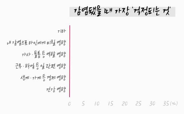 또 주목할 만한 부분은 <감염됐을 때 가장 걱정되는 것>이 무엇인지 묻는 질문에 33.2%가 내 감염으로 타인에게 미칠 영향이라고 답해, 본인의 생계·가계 등 경제에 미칠 영향(25.2%)이나 건강 영향(25.1%)보다 더 민감하게 반응했습니다. 지난 넉 달 동안 한국의 대다수 구성원이 '남에게 피해를 주어서는 안 된다'는 감염에 대한 자기 책임감을 키워온 결과이면서도 타인이나 주변에 '민폐'가 될 수 있다는 두려움이 커진 것이라고 유 교수는 설명합니다.