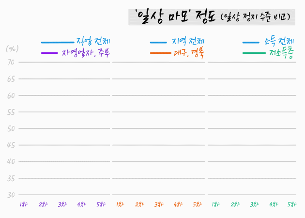 유명순 교수는 1차 조사 때부터 코로나19로 지금 어떤 집단이 가장 일상 활동에 지장을 받고 있는지도 조사해왔는데요. 넉 달이 지난 상황 내내 지역적으로는 대구 경북 지역에서, 직업적 분류에서는 자영업자와 주부, 소득별로는 저소득층의 일상 정지 수준이 전체 평균보다 낮은 것으로 나타났습니다.