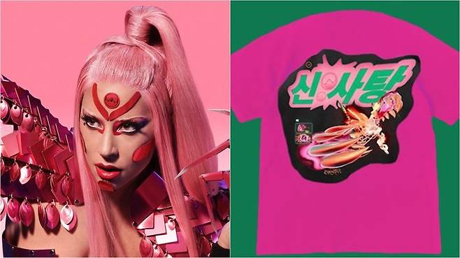 그중에서도 곡 제목 'Sour Candy'를 한국어 그대로 번역해 '신 사탕'으로 적은 티셔츠가 눈길을 끌었는데요, 티셔츠 앞쪽에는 '신 사탕', 뒤쪽엔 'LADY GAGA AND BLACKPINK LOVE YOU'라고 적혀있었습니다.