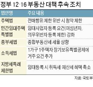 정부는 17일 ‘주택시장 안정을 위한 관리방안’에서 △종부세 양도세 강화 △임대등록 혜택 축소 △불법전매 청약 제한 등 법률 개정 사항을 하반기에 신속히 개정하겠다고 밝혔다. ‘12·16 대책’의 주요 내용은 △15억원 초과 대출 금지 △실거래 조사 상시화 △분양가 상한제 확대 △종부세 인상 등이다.