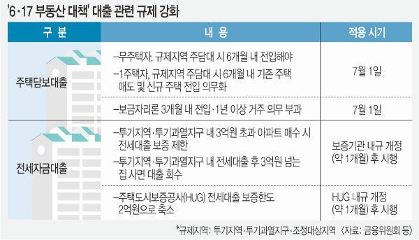 서울에서 대출받고 ‘갭투자’(전세 끼고 주택 구입)에 나서는 길목이 사실상 전면 차단된다. 다음 달부터 규제 지역(투기지역·투기과열지구·조정대상지역)에서 주택담보대출을 받고 집을 산 무주택자는 가격과 관계없이 6개월 내 구입한 집으로 전입해야 한다. 1주택자의 경우 6개월 내 보유 주택을 팔고 새로 산 집으로 옮겨야 한다. 기존 최단 1년 기한이 6개월로 더 줄었다. 7월 중 전세대출을 받고 투기지역·투기과열지구 내 시가 3억원 초과 아파트를 샀다면 즉시 대출이 회수된다.