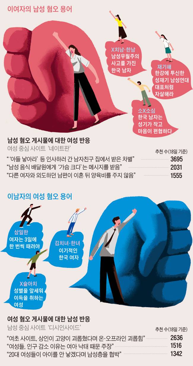 요즘 20대 남녀들은 처음 만나는 자리에서 이처럼 '사상 검증'을 벌이는 게 통과의례처럼 자리 잡고 있다. 내면에 잠재한 남녀 혐오 심리를 찾아내 향후 관계 설정에 나침반처럼 삼기 위해서다. 그동안 한국 사회 집단 갈등을 대표하는 키워드는 주로 지역 갈등이나 세대 갈등이었다. 출신 지역이나 노소(老少) 대립이 사회문제로 비화하는 경우가 적지 않았다. 그런데 2010년대 후반을 지나면서 남녀가 상대에 대한 차별 문제를 강조하는 '성(性) 갈등'이 심각한 사회문제로 떠오르는 상황이다. 2010년대 중반까지만 해도 '한남충(한국 남자는 벌레)' '김치녀(여자들 허영을 조롱하는 단어)' 같은 혐오성 성차별 단어는 일부 인터넷 공간에만 있다고 여겼다. 그러나 지금은 이런 게시물이 곳곳에서 넘쳐나고 현실 공간까지 점령하고 있다.