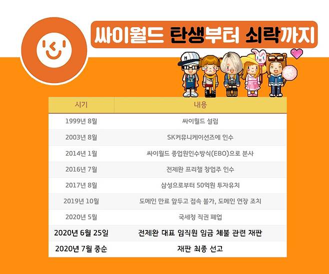 전 대표는 오는 25일 서울동부지방법원에서 싸이월드 직원 임금 체불과 관련해 재판을 받는다. 경영난을 겪으면서 직원들 임금 10억원가량을 지불하지 못한 상태다. 선고는 7월 중순께 예상된다. 더 이상은 시간을 끌 수도 없는 상황이다.