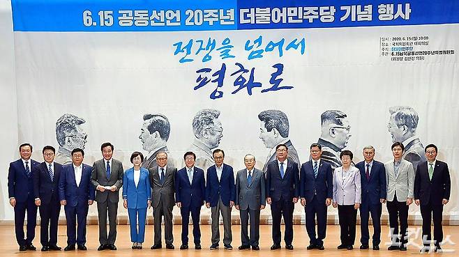 15일 오전 의원회관에서 열린 '6·15 공동선언 20주년 더불어민주당 기념행사' 에 참석한 이해찬 대표와 김태년 원내대표 등이 기념촬영을 하고 있다. (윤창원 기자)