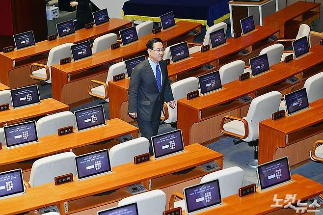 미래통합당 주호영 원내대표는 15일 더불어민주당이 상임위원장 선출을 강행하자 원내대표직 사퇴 의사를 밝혔다. 사진은 이날 오후 국회 본회의에서 의사진행 발언을 마치고 본회의장을 떠나는 주 원내대표의 모습. (윤창원 기자)