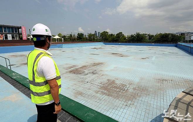 코로나19 재확산 추세로 잠정 연기된 서울 여의도 한강공원 수영장의 19일 모습. 한강 사업본부는 코로나 19 상황 변화를 종합적으로 검토해 올해 물놀이장 개장 여부를 7월 중순 최종적으로 결정하기로 했다. (이한형 기자)