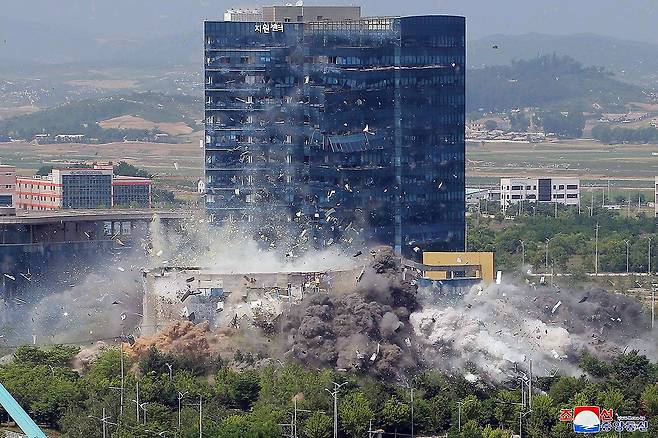 북한 김여정 제1부부장이 개성 남북공동연락사무소 폭파를 암시한지 3일 만에 북한이 16일 전격적인 폭파를 실행했다. 사진은 17일 조선중앙통신이 보도한 폭파 모습. (사진=연합뉴스)