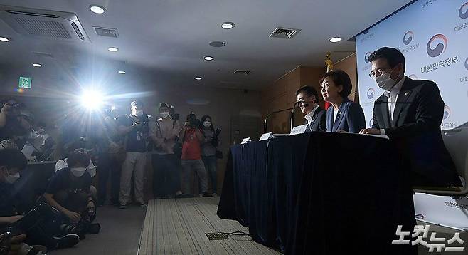 김현미 국토교통부 장관(가운데)이 17일 정부서울청사에서 손병두 금융위원회 부위원장, 김용범 기획재정부 1차관과 함께 6.17 부동산 대책 ‘주택시장 안정을 위한 관리방안’을 발표하고 있다. 국토부는 이번 부동산정책을 통해 수도권 절반을 투기 과열 지구 등 규제 지역으로 묶었고, 전세를 끼고 집을 사는 이른바 ‘갭투자’ 를 원천 차단하기로 했다. (이한형 기자)