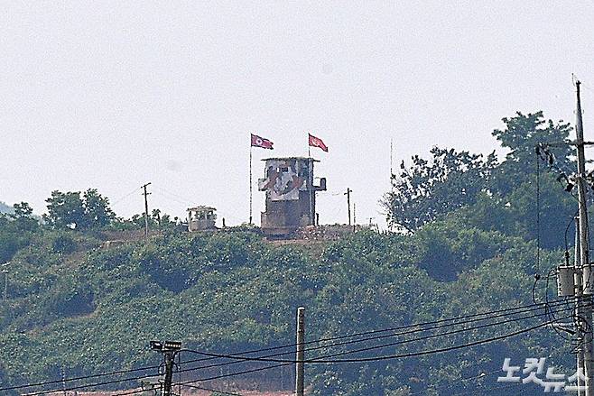 개성 남북공동연락사무소를 폭파한 북한이 금강산 관광지구와 개성공단 지역에 군부대를 전개할 것이라고 밝힌 17일 경기도 파주 접경지역에서 바라본 북한 초소에 인공기와 최고사령관기가 다시 게양돼 있다. (박종민 기자)