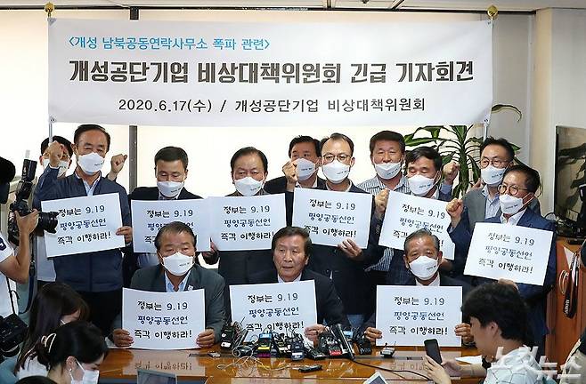 개성공단기업협회장인 정기섭 개성공단기업 비상대책위원장 등 입주 기업 대표들이 17일 오후 서울 여의도 개성공단기업협회에서 기자회견을 열고 북한의 남북공동연락사무소 폭파 관련 입장을 밝히고 있다. (황진환 기자)