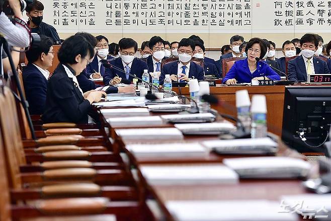 추미애 법무부 장관이 18일 오전 국회 법제사법위원회 전체회의에 출석해 질의를 받고 있다. 추 장관은 "'한명숙 사건'은 대검찰청 감찰부가 조사해야 하는 사안이 맞느냐"는 여당의 질의에 "감찰 사안이다. 그것이 마치 인권 문제인 것처럼 문제를 변질시켜서 인권감독관실로 이첩한 것은 옳지 않고 관행화돼서는 절대 안 된다"고 강조했다. (윤창원 기자)