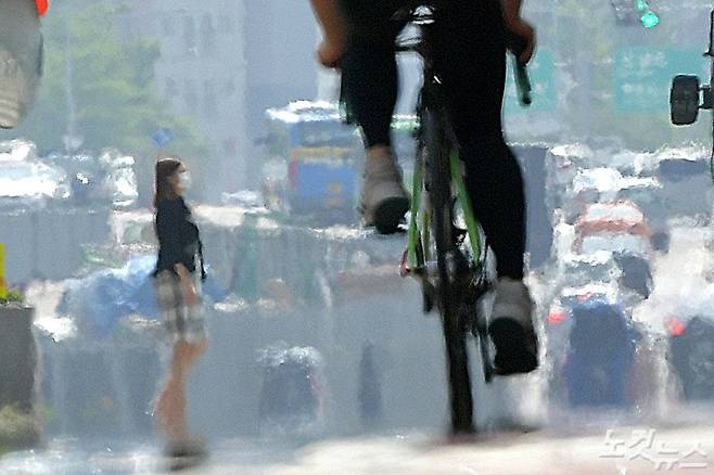 30도 안팎의 무더위가 이어진 16일 오후 시민들이 서울 여의도 달궈진 도로를 건너고 있다. (박종민 기자)
