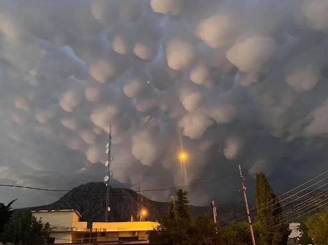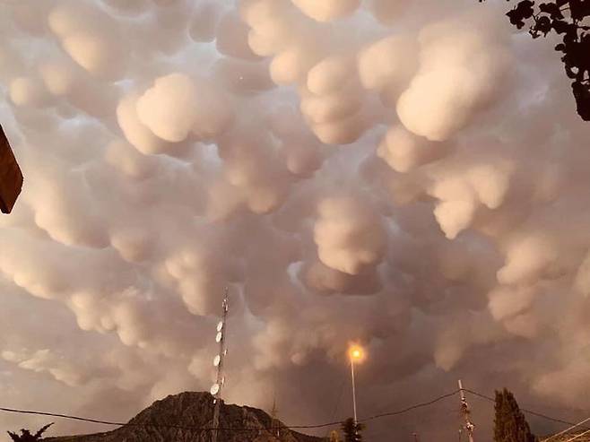 천문 전문 웹사이트 '어스스카이(Earthsky)'에 따르면 이 구름은 '유방운(Mammatus Clouds)'으로, 젖소의 유방 모양을 닮았다 하여 이름 붙여졌습니다. 보통 폭풍이나 악천후의 전조로 나타나고, 짧으면 10분에서 길어도 1시간 안에 사라지는 것이 특징입니다.