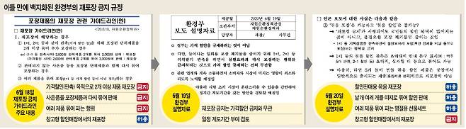 환경부가 묶음 할인판매를 금지한 속칭 ‘재포장 금지법’의 시행(7월 1일)을 열흘 앞두고 시행 계획을 지난 20일 사실상 백지화했다. 식품·유통업계에 규제 가이드라인을 제시한 지 이틀 만이고, 한국경제신문이 이 같은 규제로 묶음 할인판매 등 마케팅 행위가 불가능해질 것이라고 보도한 지 하루 만이다. 환경부는 비난 여론이 거세지자 원점에서 재검토하기로 했다. 규제 시행 시기 등은 22일 다시 발표하기로 했다.