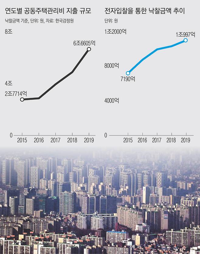 지난해 기준 연간 20조원 규모의 관리비 중 개별 가구가 내는 각종 공과금, 단지 차원에서 납부하는 세금 등을 제외한 실제 ‘공동주택관리비용’은 6조6605억원이다. 관리비로 발주된 각종 공사 등의 낙찰금액을 합산한 결과다. 의무관리대상 공동주택의 관리비 사용내역 공개가 의무화되면서 이 비용은 매년 큰 폭으로 증가추세에 있다. 2015년 2조7714억원에서 2017년 3조9456억원으로 늘었고, 지난해엔 6조원을 넘어섰다. 앞으로도 3시 신도시 건설 등 굵직한 개발사업이 예정돼있어 관리비 규모는 계속 확대될 것으로 전망된다.