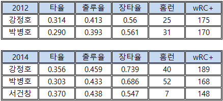 간혹 논란이 있기도 하지만 MVP가 각 시즌의 1인자로 기억되는 KBO의 현실을 보면 2012, 2014시즌 2인자는 wRC+가 가장 높았던 강정호라 봐도 무방하다.