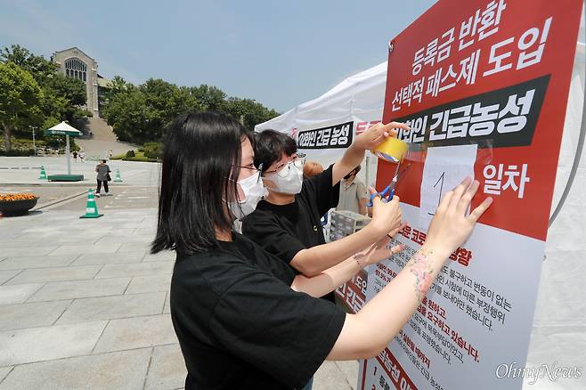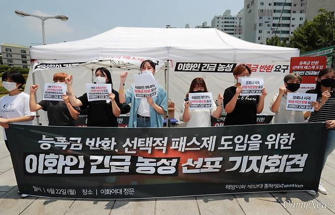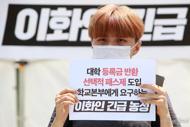 | ▲ 이화여대 총학생회(총학생회장 오희아)는 코로나19 사태 이후 부실한 온라인 강의가 진행되는 등 학생들의 권리가 침해되고 있다며 22일 오전 서울 서대문구 이화여대 정문에서 등록금 반환, 선택적 패스제 도입을 촉구하며 긴급 농성에 돌입했다. |