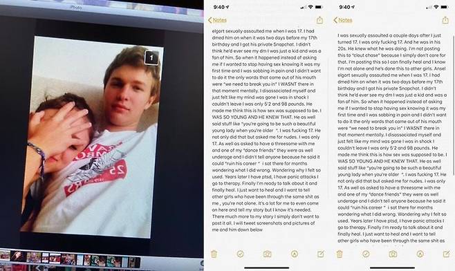 앞서 개비라는 이름의 한 여성은 "17살 때 안셀 엘고트로부터 성폭행을 당했다"고 폭로했습니다. 엘고트와 찍은 사진을 증거로 공개한 이 여성은 "17살 생일을 이틀 앞둔 날 안셀 엘고트로부터 SNS 메시지를 받았다"면서 이후 만남이 이뤄진 뒤 성폭행을 당했고, 누드 사진도 요구받았다고 주장했습니다.