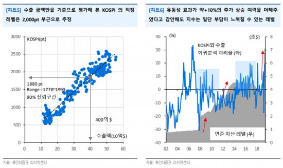2000년 이후 수출금액과 코스피 간의 회귀 분석을 이용해 적정 코스피를 추산해 보면 현재 수출 레벨(월평균 400억달러)에서 약 2000포인트 부근까지의 지수 레벨이 설명된다고 볼 수 있다.