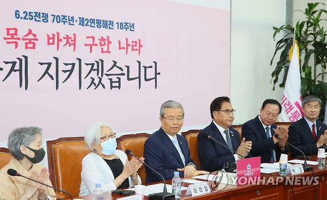(서울=연합뉴스) 진성철 기자 = 미래통합당 김종인 비상대책위원장(왼쪽 세번째 부터), 박진 외교안보특위원장 등이 23일 국회에서 6·25전쟁납북인사가족협의회 이미일 이사장 등 임원들을 만나고 있다. 2020.6.23