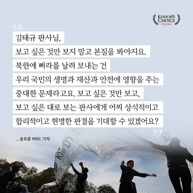 송요훈 MBC 기자가 김태규 부산지법 부장판사의 대북전단 살포 옹호를 두고 "보고 싶은 것만 보고, 보고 싶은 대로 보는 판사에게서 상식적인 판결을 기대할 수 없다"며 일침을 가했습니다.