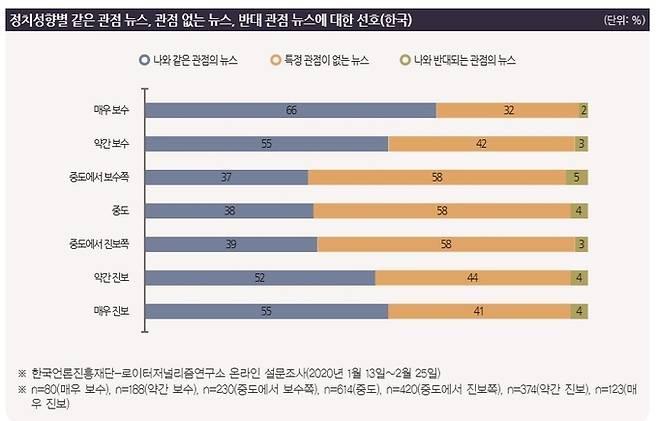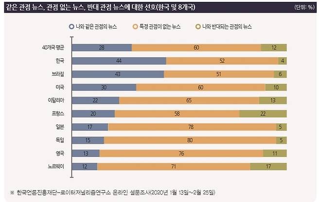 영국 옥스퍼드대 부설 로이터저널리즘연구소의 한국 파트너인 한국언론진흥재단은 지난 17일 ‘편향적 뉴스 이용과 언론 신뢰 하락(6권3호, 이소은·박아란 언론재단 선임연구위원)’을 통해 ‘디지털 뉴스 리포트 2020’ 주요내용을 공개했다. 조사에서 한국은 ‘나와 같은 관점의 뉴스’를 선호한다는 뉴스 이용자 비중이 44%(전체평균 28%)에 달하는 국가였다. 총 40개국 중 네 번째, 터키(55%), 멕시코(48%), 필리핀(46%) 다음이었다. ‘나와 반대되는 관점의 뉴스를 선호한다’는 한국 응답은 4%에 불과해 체코(3%), 헝가리(3%), 대만(3%), 폴란드(3%)에 이어 낮은 수준이었다. ‘특정 관점이 없는’ 뉴스를 선호한다는 비중이 압도적으로 높은 독일(80%), 일본(78%), 영국(76%), 노르웨이(71%) 등 국가와 대비됐다.