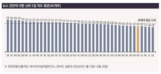 언론재단은 정치성향이 뚜렷하고 정치 관심도가 높은 이들에게서 이 같은 뉴스 선호 성향이 도드라졌다고 지적하며 원 보고서를 인용, “뉴스 전반에 대한 신뢰 하락이 이용자의 뉴스 이용 편향성 때문일 수 있다”고 전했다. “저널리즘 자체의 품질보다는 사람들이 언론 기관에 불만족하거나 언론이 전달하는 뉴스의 관점에 동의하지 못하는 경우가 뉴스 전반에 대한 신뢰 하락에 영향을 주었을 것”이란 의미다. 실제 이번 설문에서도 한국은 ‘뉴스 전반에 대해 신뢰한다’는 응답이 전체 21%로 40개국 중 가장 적은 국가였다. 신뢰와 불신, 중립 등 응답을 모두 포함한 5점 척도 평균으론 36위, 프랑스, 미국, 칠레의 앞 순위였다.
