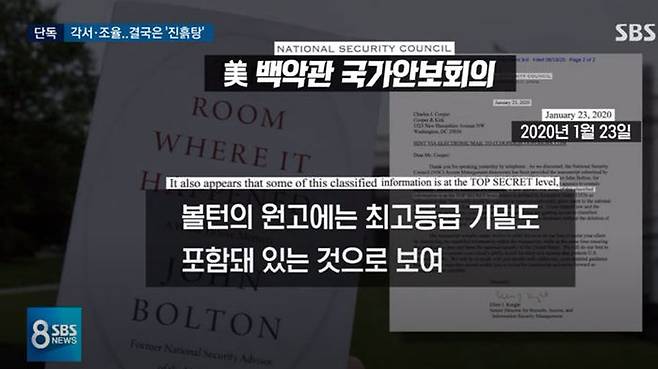 볼턴 회고록의 초안은 지금보다 훨씬 수위가 높았던 것으로 짐작됩니다. 볼턴이 올해 초 백악관에 회고록을 내겠다며 제출했을 때, 이를 처음 검토한 백악관 NSC 직원의 이메일에 그런 흔적이 강하게 남아 있습니다. 이 백악관 직원은 "회고록을 한번 봤는데 기밀 사항이 아주 많았고, 최고 등급의 국가 기밀까지 포함돼 있었다"고 놀라서 답을 했습니다. 볼턴이 보안 각서를 썼기 때문에 회고록을 출간할 수 없다며 거부 의사를 나타내기도 했습니다.