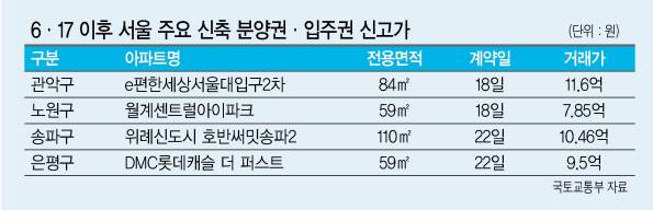 ▶21번째 대책 이후로도 호재 있는 지역 반짝 급등=6·17대책 이후에도 신고가 거래가 빈번히 이뤄져, 정부 정책과 무관한 ‘신축 수요’가 있음을 나타냈다. 서부선 호재가 있는 관악구 봉천동의 e편한세상서울대입구 2차는 6월에만 6건의 입주권이 팔렸는데 그중 3건은 6·17대책 다음날인 18일 거래됐다. 이날 거래된 3건 가운데 84㎡가 11억6000만원에 계약서를 쓰면서 신고가에 손바뀜됐다.