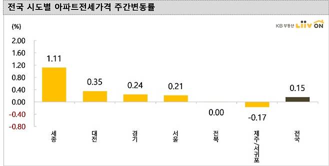 세종이 1.06%로 급등했고 △충남 0.17%△경남 0.16%, 충북 0.14% △전남 0.13% △경북 0.08% △강원 0.05% 씩 올랐다. 전북은 -0.01% 하락했다.