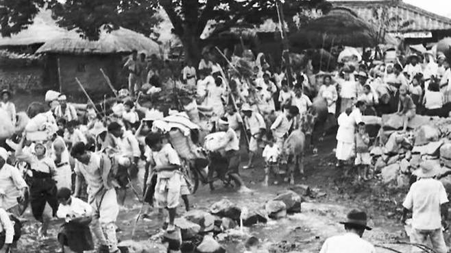 후퇴하는 군을 따라 피난길에 오른 주민들.