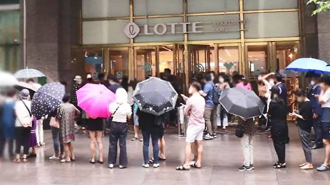 비 내리는 이른 아침, 백화점 앞에 사람들이 꼬리에 꼬리를 물고 서 있습니다.