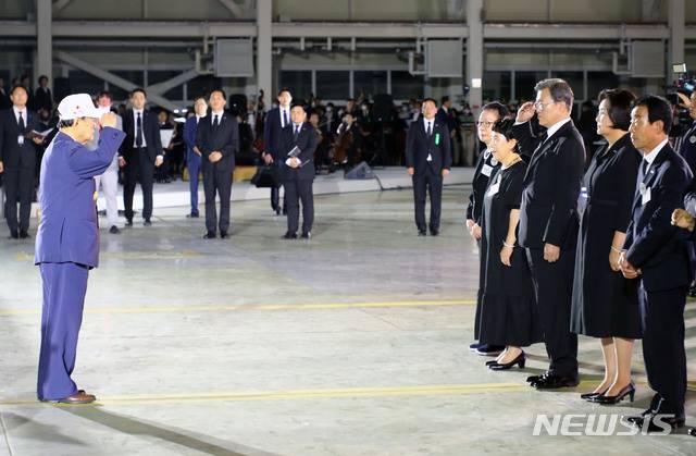 [성남=뉴시스]배훈식 기자 = 문재인 대통령이 25일 경기 성남시 서울공항에서 열린 6·25전쟁 제70주년 행사에 참석해 6.25 참전용사의 류영봉 이등중사의 복귀신고를 받고 있다. 2020.06.25.