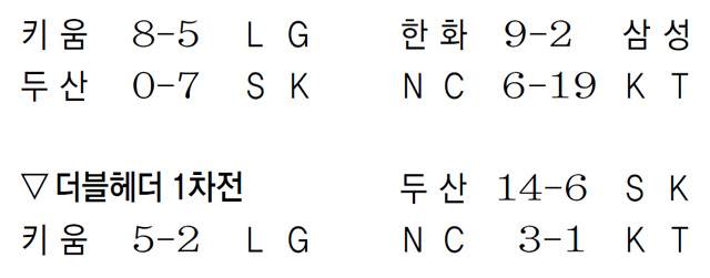 수원에서는 선두 NC가 1차전에서 KT를 3-1로 물리치며 30승(12패) 고지에 올랐다. 2차는 KT의 19-6 승리로 끝났다. 한 경기만 열린 대구에서는 한화가 삼성을 9-2로 물리치고 이번 주 첫 승을 기록했다. 부산 사직구장에서 열릴 예정이던 KIA와 롯데의 더블헤더 경기는 1, 2차전 모두 비로 취소됐다.