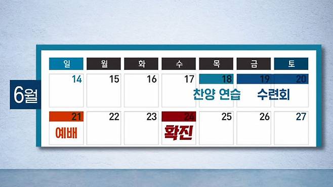 A 씨는 지난 18일 20여 명과 성가대 연습을 한 뒤 19일과 20일 대부도에서 열린 교회 수련회에 참석했고 21일에는 일요 예배에 참석한 것으로 조사됐습니다.
