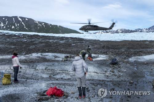 In this June 18, 2020, photo provided by the U.S. Air Force Mortuary Affairs Operations, an Alaska Army National Guard UH-60 Black Hawk helicopter departs Colony Glacier after dropping off personnel recovery team members assigned to Joint Base Elmendorf-Richardson, Alaska. A military plane carrying 41 passengers and 11 crew members crashed into a mountain near Anchorage in 1952, but remains of the victims are still being discovered. (Senior Airman Jonathan Valdes Montijo/U.S. Air Force via AP)