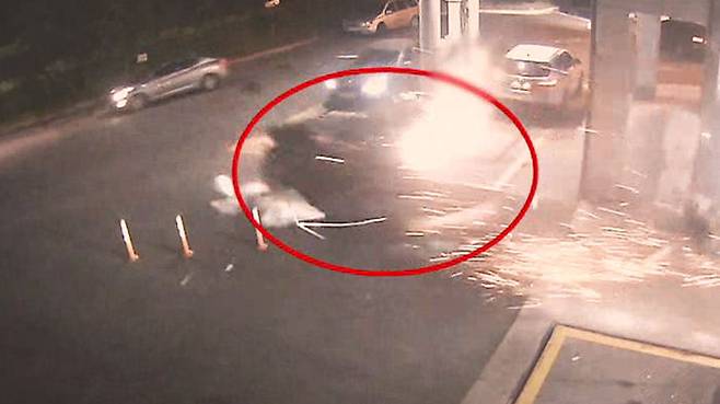 불꽃 내며 미끄러진 승용차, 1초 만에 주유소 '쾅'