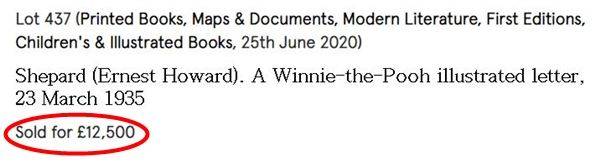 '곰돌이 푸' 편지는 감정 결과 2천 파운드(약 300만 원)에서 4천 파운드(약 600만 원)의 가치를 지닌 것으로 드러났고, 결국 지난 25일 경매에 올라 무려 1만 2천500파운드, 우리 돈으로 약 1천860만 원에 판매됐습니다.