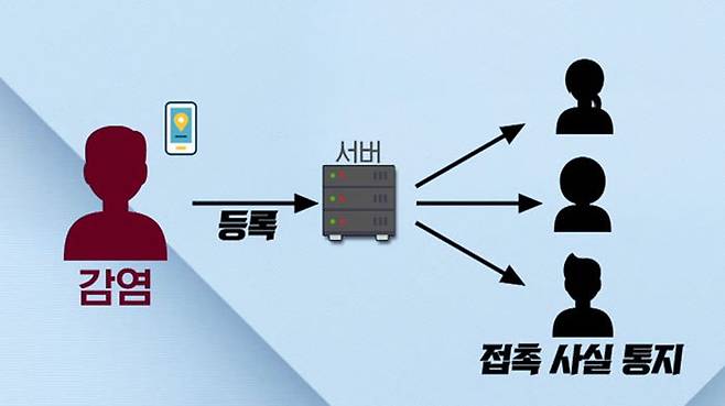 사용자가 코로나 확진 사실을 앱에 등록하면 서버에 저장된 지난 2주간 밀접접촉자들에게 검사받으라고 알려주는 구조입니다.