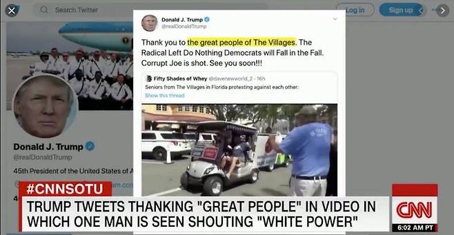 지금은 삭제된 영상에는, 골프 카트에 탄 백인 남성이 시위대와 언쟁을 벌이다 "백인의 힘! 백인의 힘!(white power! white power!)"이라는 백인 우월주의 단체의 구호를 연호하는 장면이 담겼습니다. 그런데 트럼프 대통령, 해당 영상을 리트윗하면서 "위대한 주민들에게 감사하다"고 쓴 겁니다.