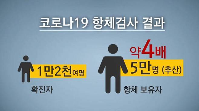 [조동찬/의학전문기자 : 흔히들 나도 모르는 무증상으로 걸렸다가 나은 것 아닐까 이런 말씀들 많이 하시는데, 바로 그 숫자가 나온 것이라고 보시면 됩니다. 현재 확진 환자는 1만 2천여 명이지만, 실제로는 그보다 4배 많은 5만 2천 명의 감염자가 국내에 있을 것이라는 것이죠. 다만 항체가 있다고 해서 반드시 다른 사람을 감염시킬 만큼 심하게 앓았다는 것은 아닐 수 있고요, 또 항체가 있다고 해서 다시는 코로나19에 걸리지 않으리라고 단정할 수도 없겠습니다.]