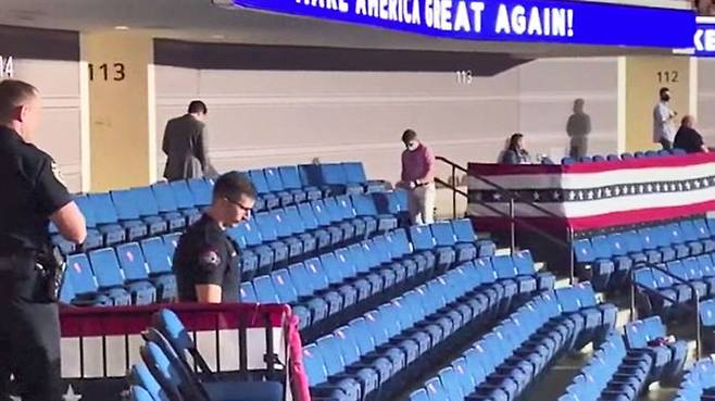 지난 20일 오클라호마주 털사에서 열린 트럼프 대통령 유세장에서는 떨어져 앉으라고 붙여둔 좌석 스티커를 행사 요원이 떼어내는 모습이 포착됐습니다.