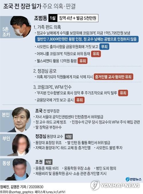 (서울=연합뉴스) 고동욱 박형빈 기자 = 조국 전 법무부 장관 일가 '사모펀드 의혹'의 핵심 인물인 5촌 조카 조범동(37)씨가 1심에서 징역 4년을 선고받았다.