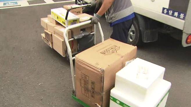 택배 회사와 아파트가 협약을 맺고 주차장에 만든 택배 분류 작업 공간은 재활용품 분류장이 됐습니다.
