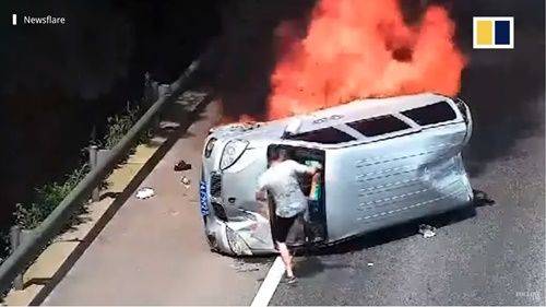 매체에 따르면 소형버스로 용감하게 달려든 남성은 지난 26일 트럭을 몰고 가다가 사고를 목격한 뒤 바로 비상차로에 차를 세운 뒤 구조하기 위해 나섰습니다.