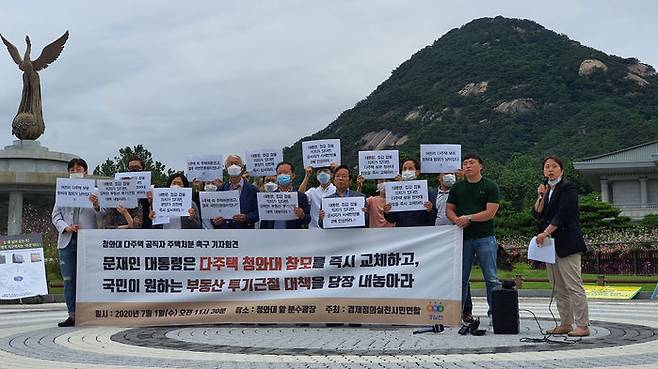 경실련은 1일 청와대 인근 분수대 앞에서 기자회견을 열고 "청와대 공직자 중 재산 보유 상위 10명의 아파트값이 (3년 동안) 평균 10억 원 오르는 동안 집 없는 서민과 청년을 위한 제대로 된 주택정책은 나오지 않았다"고 비판했습니다.