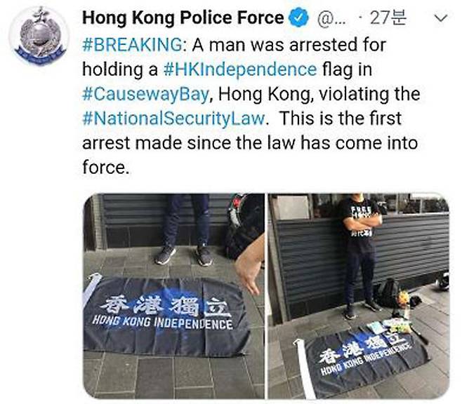 홍콩 경찰은 오늘(1일) 트위터에 홍콩 독립 깃발을 들고 있던 한 남자를 홍콩보안법 위반 혐의로 체포했다고 밝혔습니다.