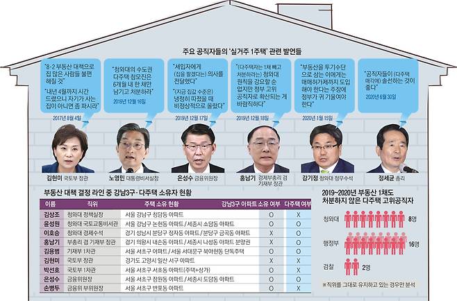 문재인 정부가 쏟아낸 부동산 정책들에 담긴 철학을 한 줄로 요약하면 이렇다. 강한 규제를 앞세운 부동산 정책이 성공하려면 고위 공직자부터 솔선수범해야 한다는 국민적 요구가 높았다. 이에 노영민 대통령 비서실장은 지난해 12월 청와대 참모진에게 “수도권에 집을 2채 이상 보유했다면 6개월 내에 한 채만 남기고 처분하라”고 권고했고, 홍남기 경제부총리 겸 기획재정부 장관도 같은 달 언론사 경제부장 오찬 간담회에서 “주택 여러 채를 보유한 정부부처 고위 공직자는 한 채만 빼고 처분하는 게 바람직하다”고 말했다.
