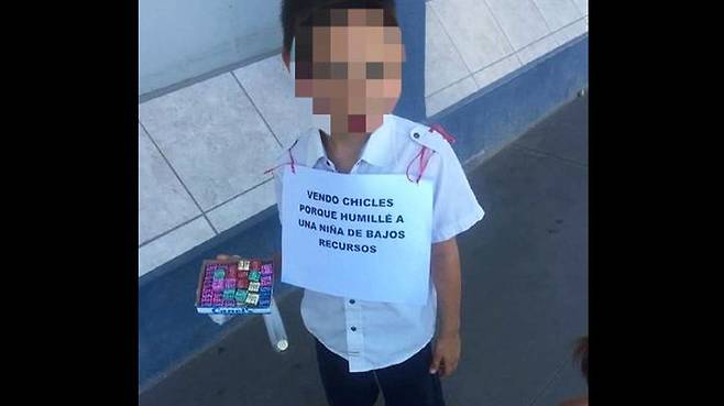 멕시코 소노라 주 산 루이스에 사는 한 소년은 목에 팻말을 걸고 매일 길에서 껌을 팔고 있습니다.