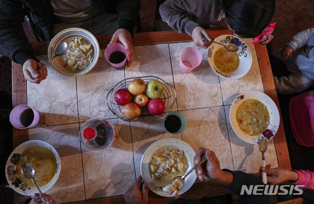 [산티아고=AP/뉴시스]1일(현지시간) 칠레 수도 산티아고 산 베르나르도에서 한 가족이 식탁에 둘러앉아 무료 급식소에서 제공한 칠레 전통 음식을 먹고 있다. 2020.07.02.